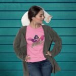 • Bold comic book-style typography in vibrant pink and gold that screams superhero power