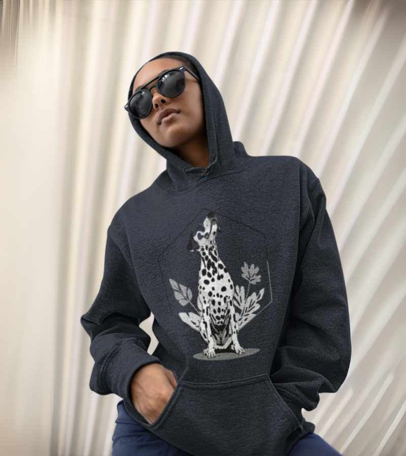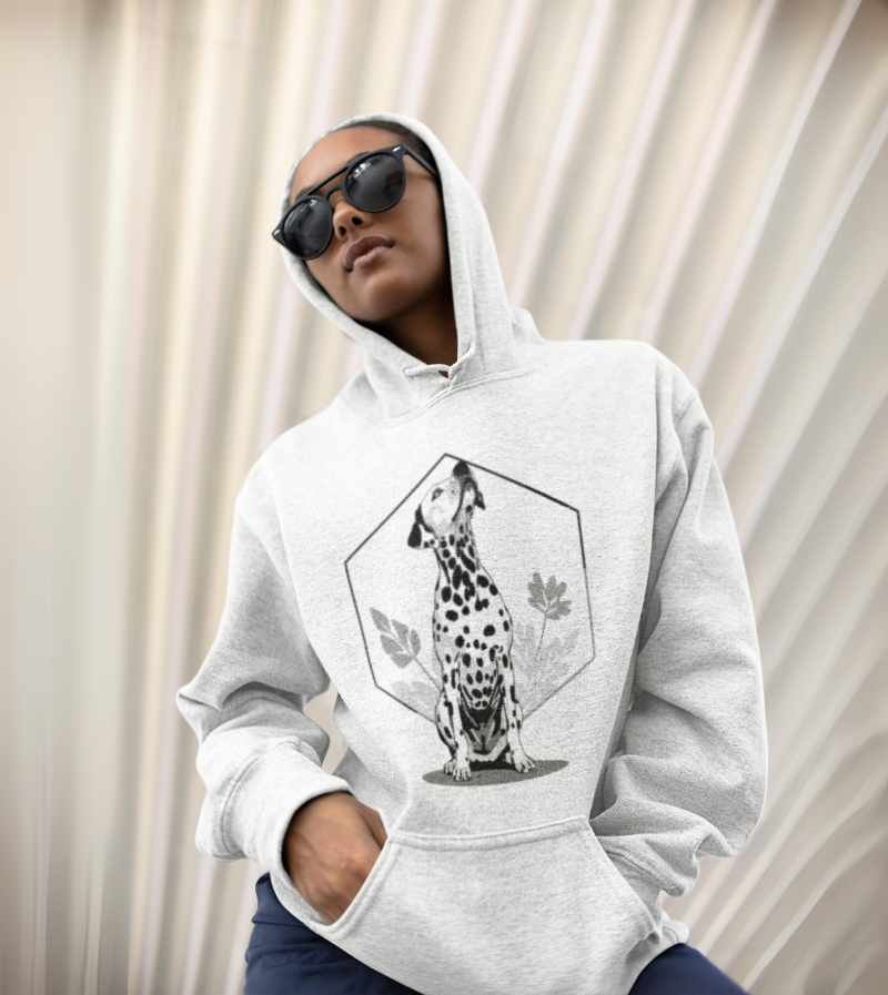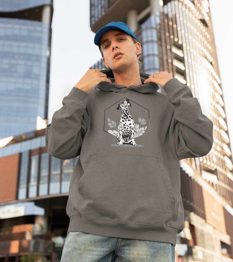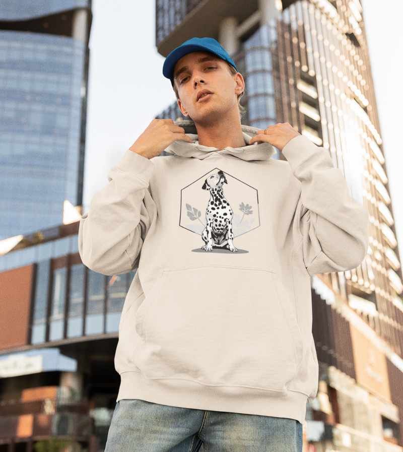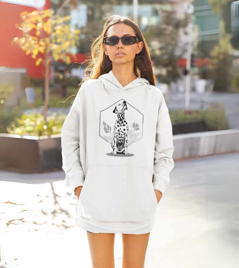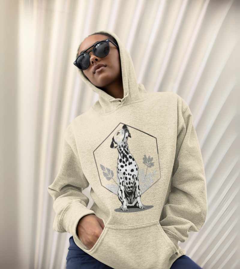 This elegant, monochrome design features a dignified Dalmatian seated proudly in front of a crisp, geometric hexagon frame and delicate botanical leaves. With its signature spots, noble posture, and clean black-and-white palette, this artwork highlights all the poise, composure, and classic style that make the Dalmatian a breed apart.