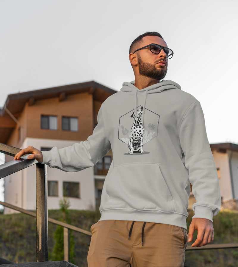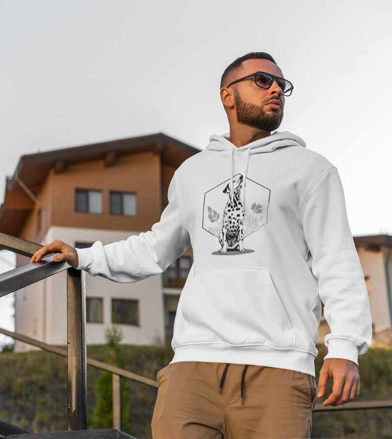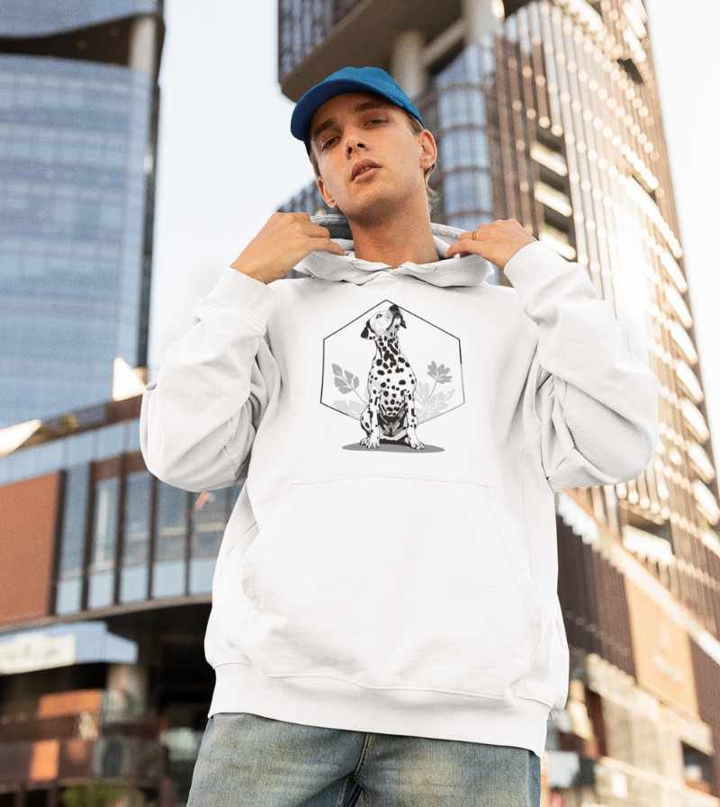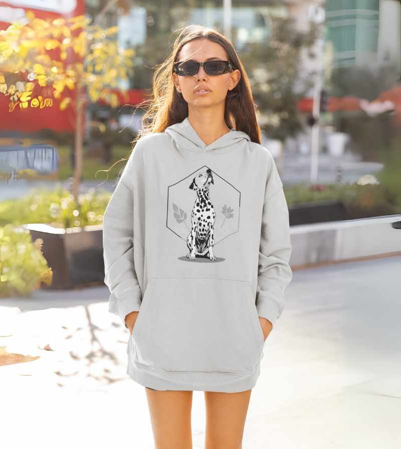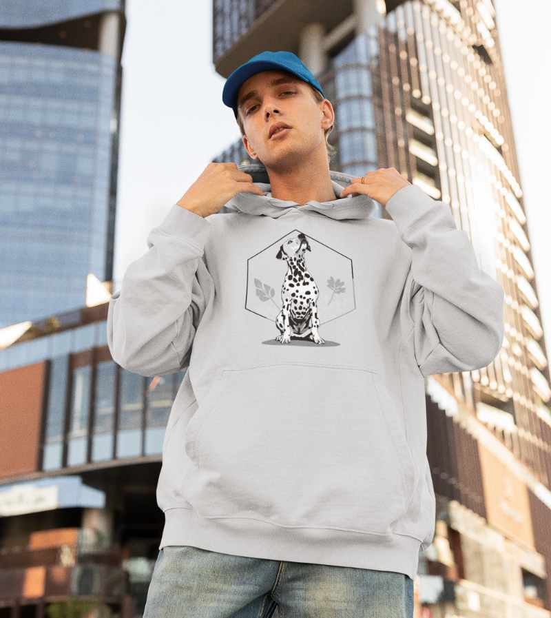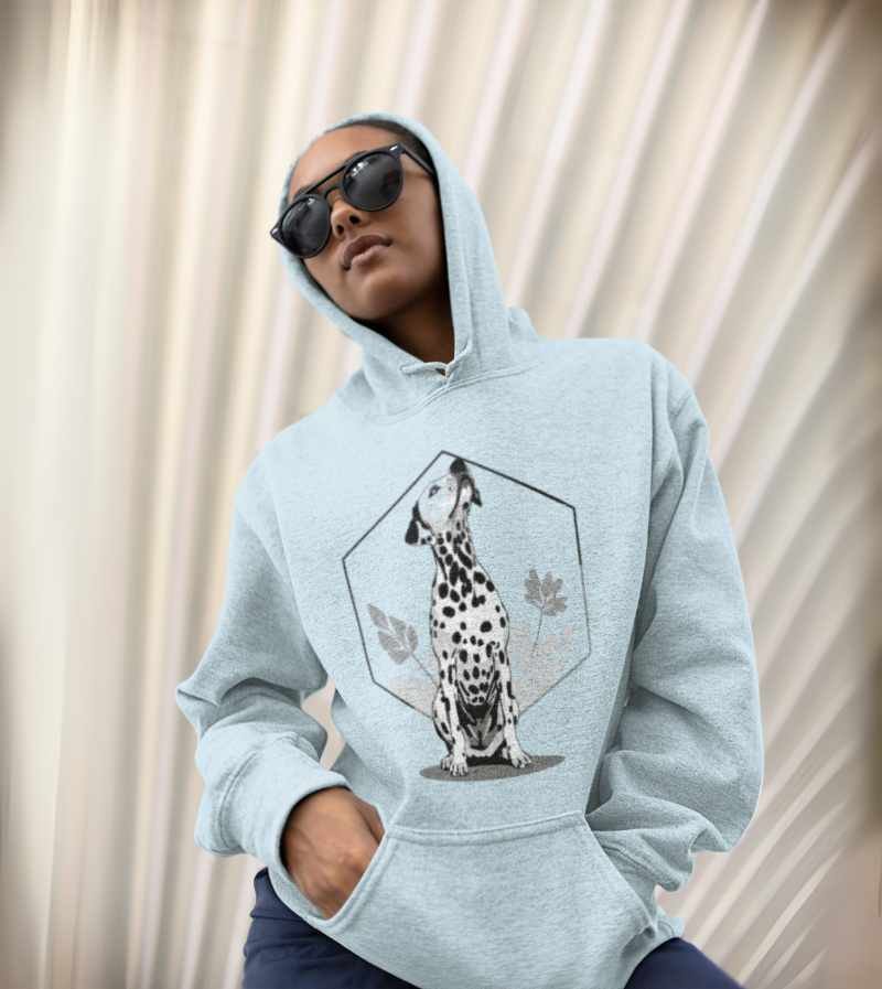 This elegant, monochrome design features a dignified Dalmatian seated proudly in front of a crisp, geometric hexagon frame and delicate botanical leaves. With its signature spots, noble posture, and clean black-and-white palette, this artwork highlights all the poise, composure, and classic style that make the Dalmatian a breed apart.