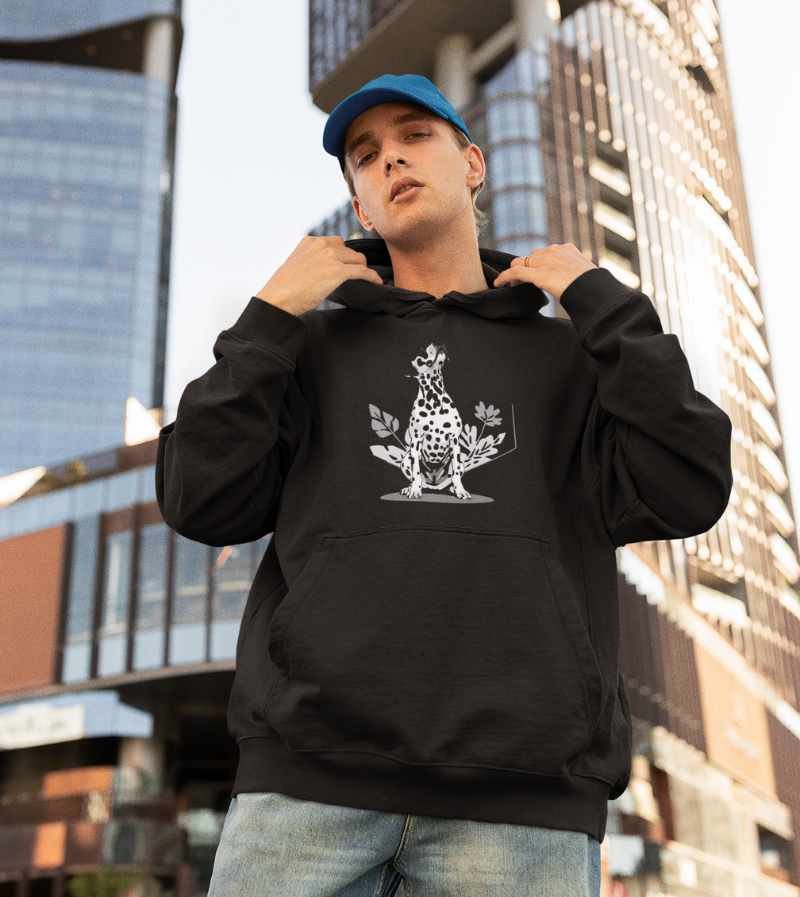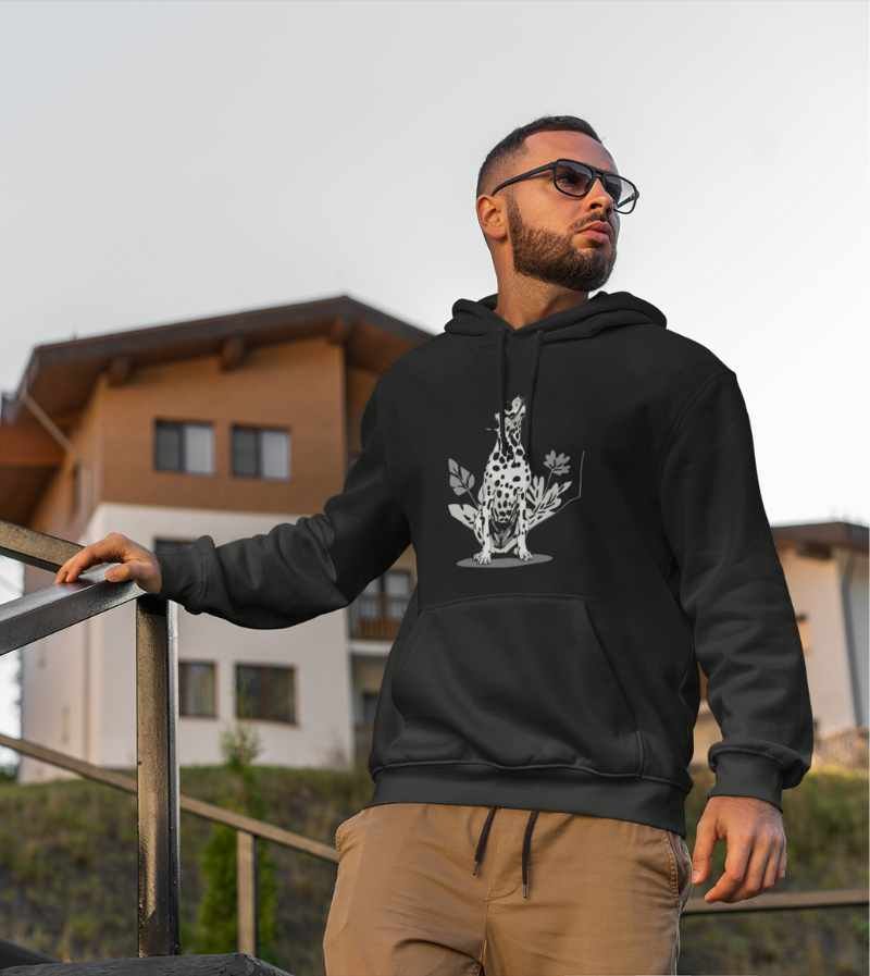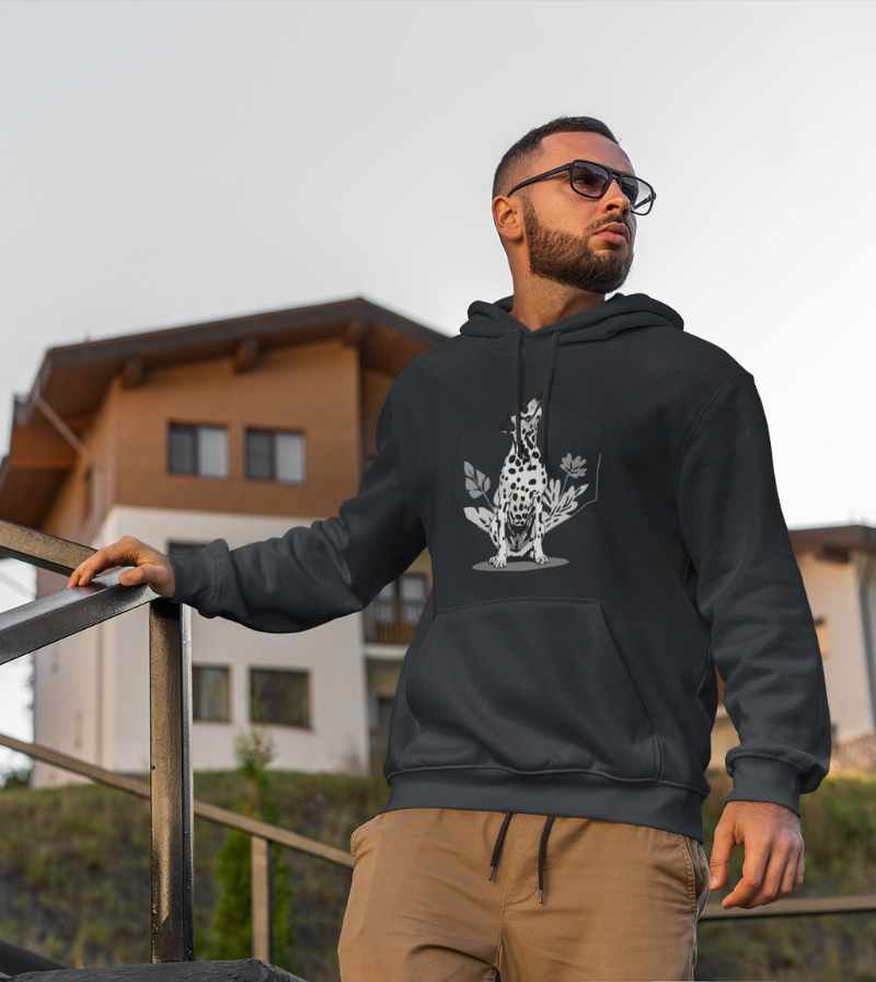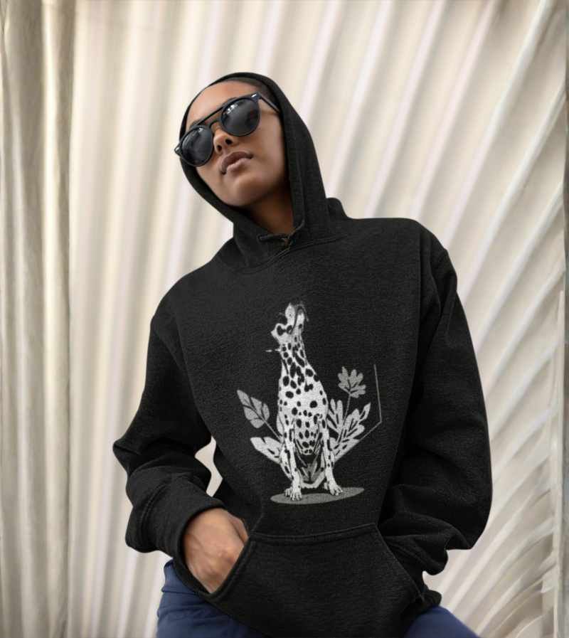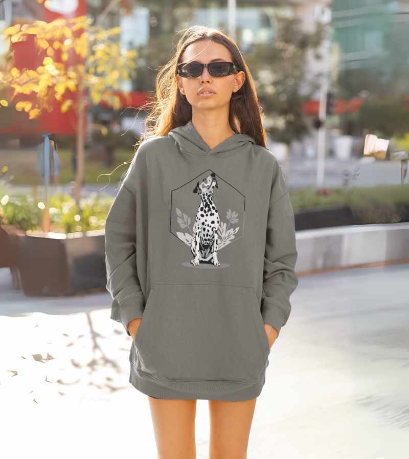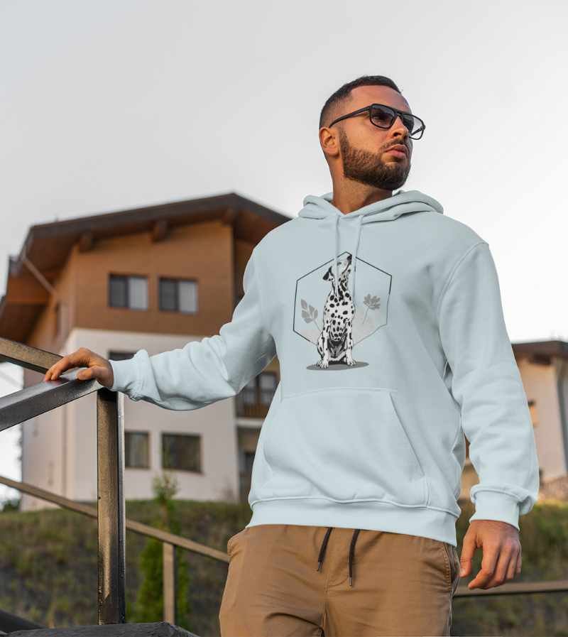This elegant, monochrome design features a dignified Dalmatian seated proudly in front of a crisp, geometric hexagon frame and delicate botanical leaves. With its signature spots, noble posture, and clean black-and-white palette, this artwork highlights all the poise, composure, and classic style that make the Dalmatian a breed apart.