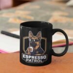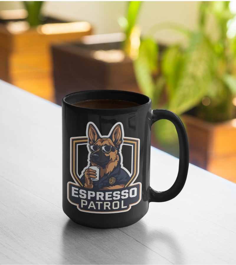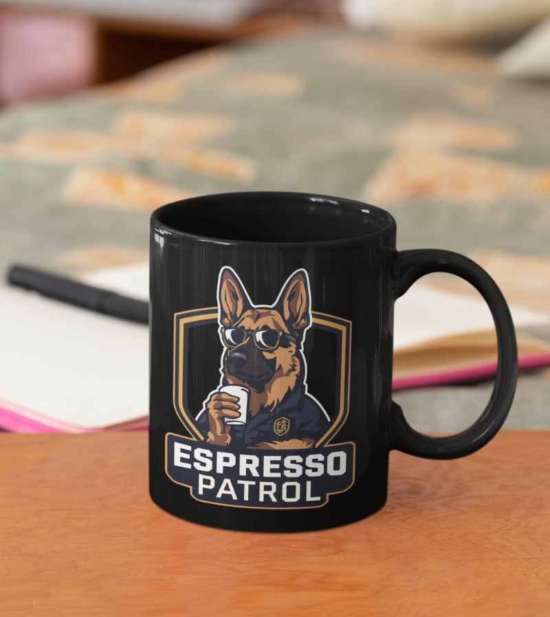This eye-catching black mug features a German Shepherd in aviator sunglasses and a badge, holding a cup of coffee—emblazoned with “Espresso Patrol” in sharp, modern lettering. Combining the reliability, alertness, and confidence of a German Shepherd with the energy of your favorite espresso, this design delivers a playful, must-have mug for anyone who takes both their brew and security seriously.