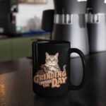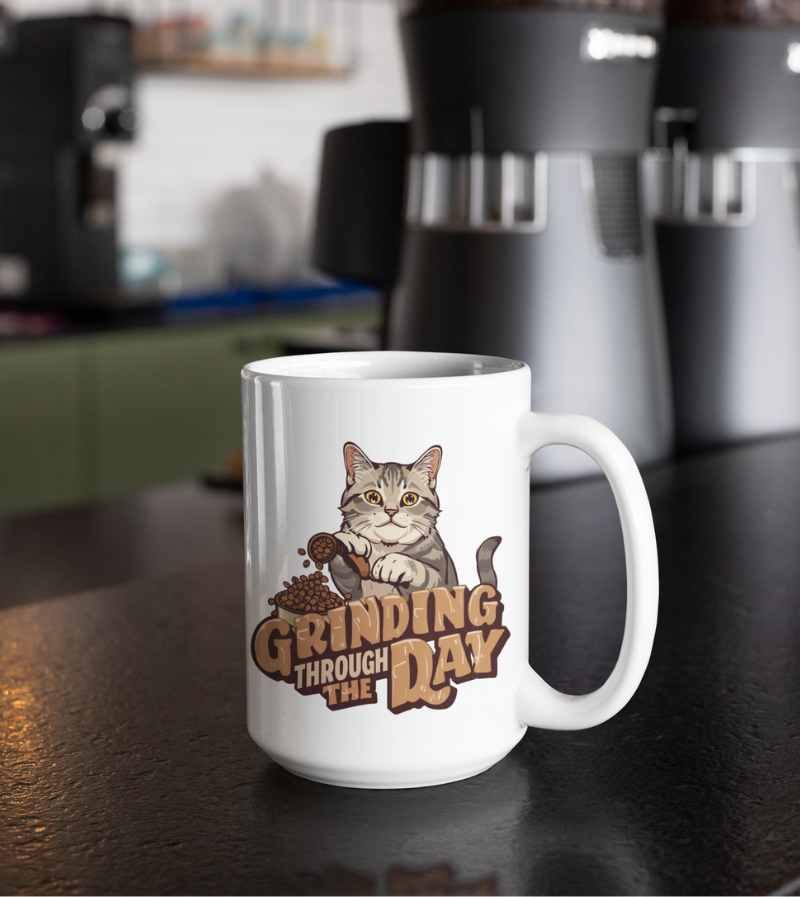 This fun white mug features an expressive tabby cat wielding a coffee scoop like a pro, coffee beans spilling out as it readies for the day’s hustle. With warm, bold lettering reading “Grinding Through the Day,” this mug perfectly captures the spirit of steady energy, resilience, and the occasional need for a little caffeine-fueled determination—just like a hard-working house cat.