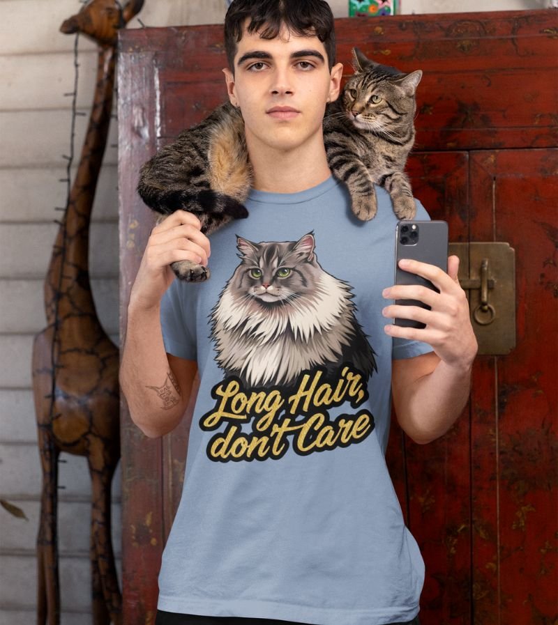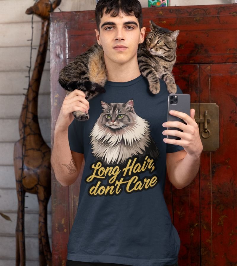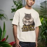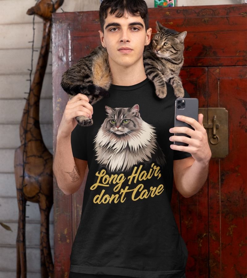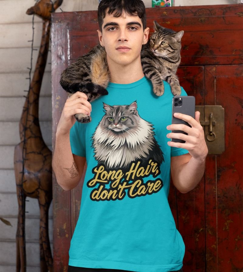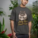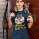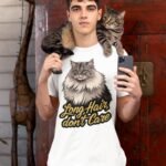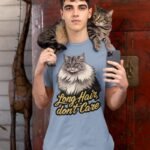 This gorgeous long-haired cat knows the secret to happiness – when you’re blessed with this much natural beauty, a little extra fur maintenance is totally worth it! With those stunning green eyes and that luxurious flowing coat, this design celebrates every fluffy feline who’s mastered the art of looking absolutely magnificent while leaving their signature everywhere.
