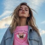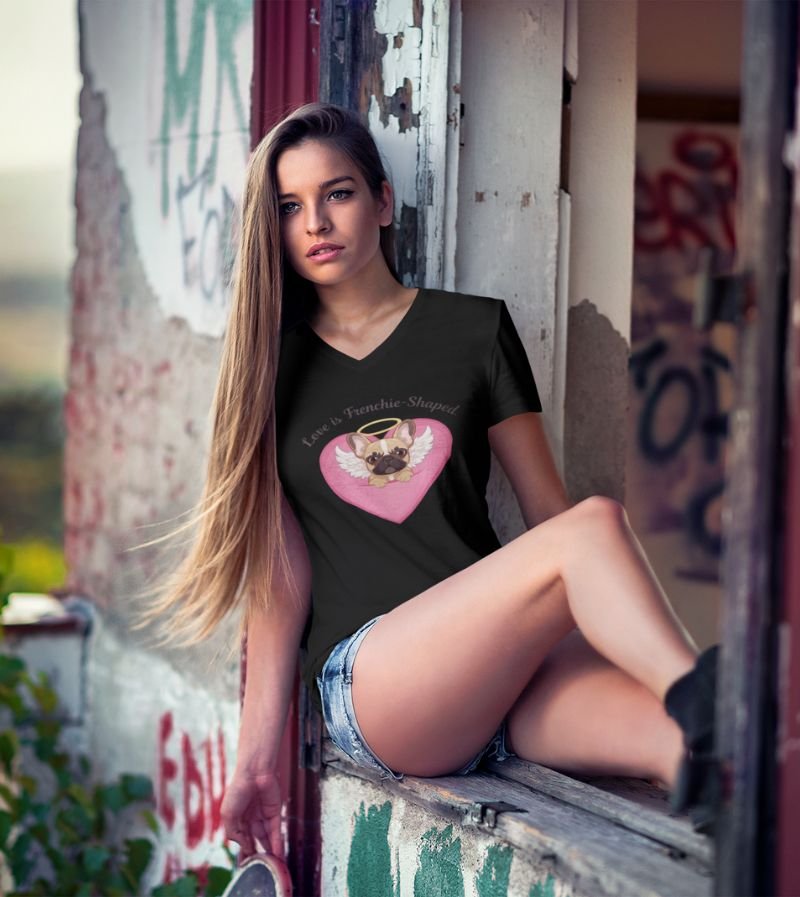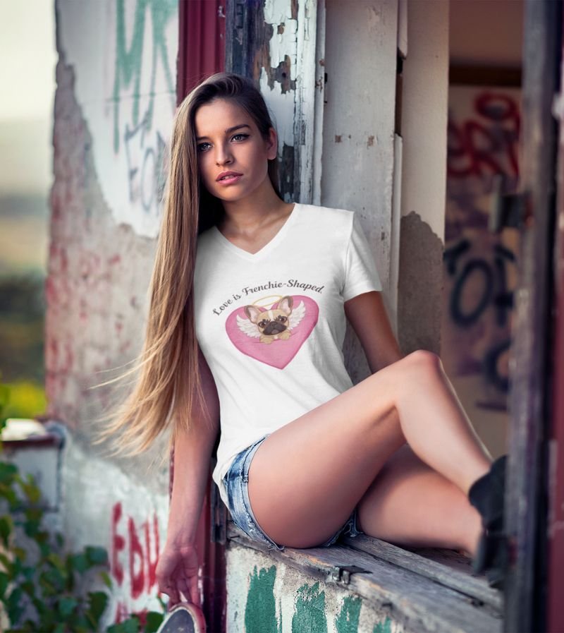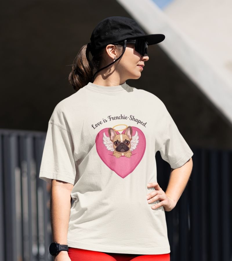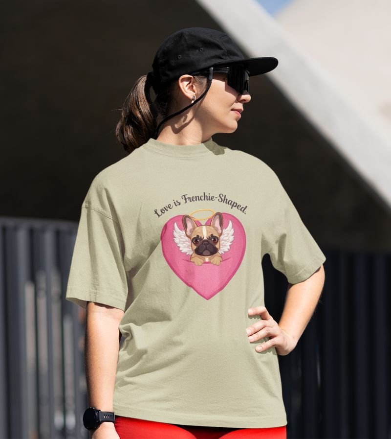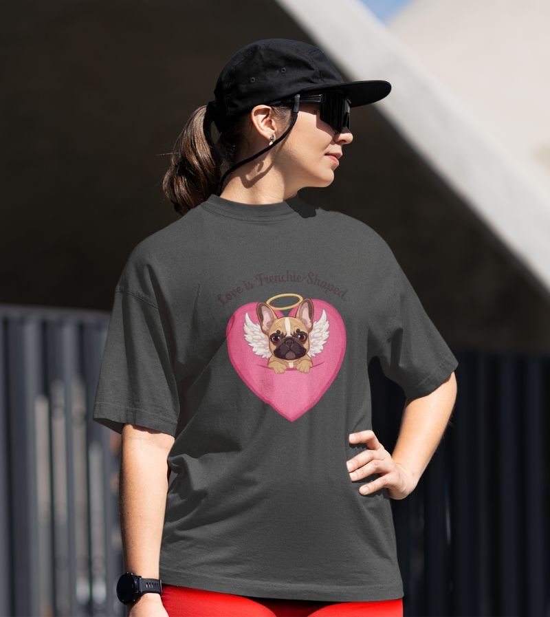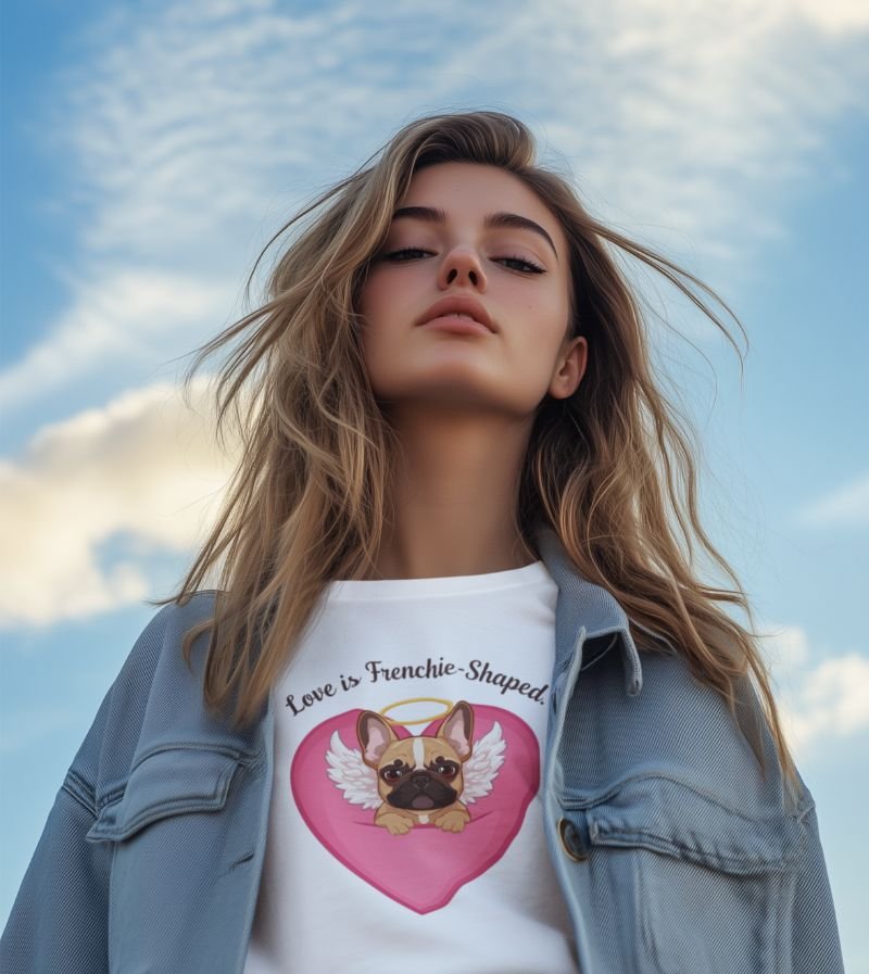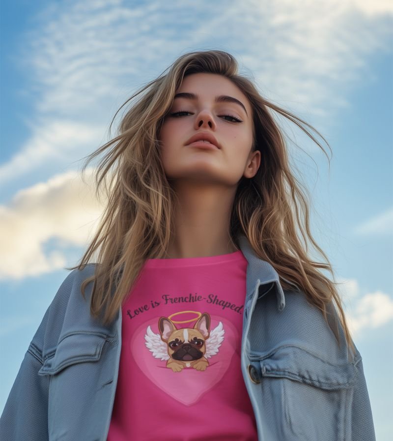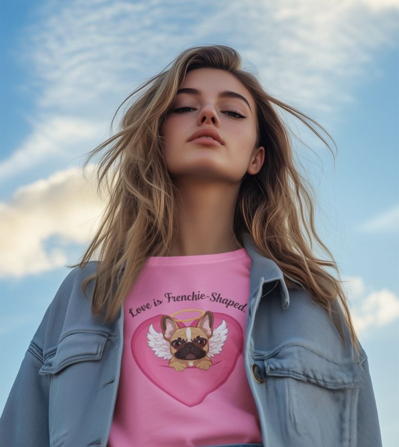 This heart-melting design showcases an adorable French Bulldog nestled sweetly inside a radiant pink heart, adorned with soft angel wings and a glowing golden halo. The soulful gaze and signature Frenchie ears radiate warmth and love, while playful script above reads “Love is Frenchie-Shaped”—declaring to the world that nothing compares to the devotion of a Frenchie companion.