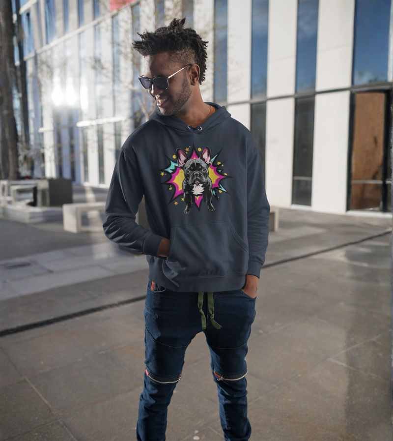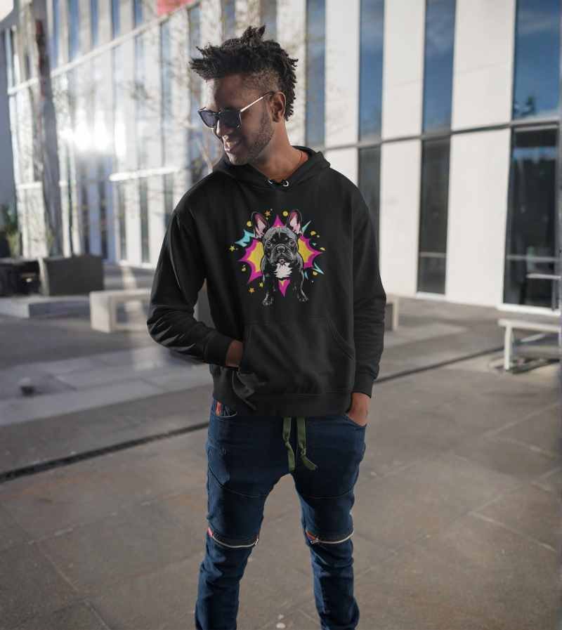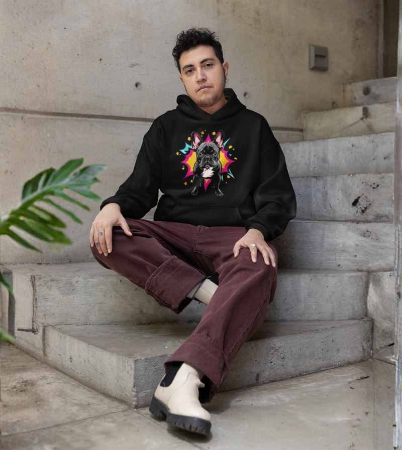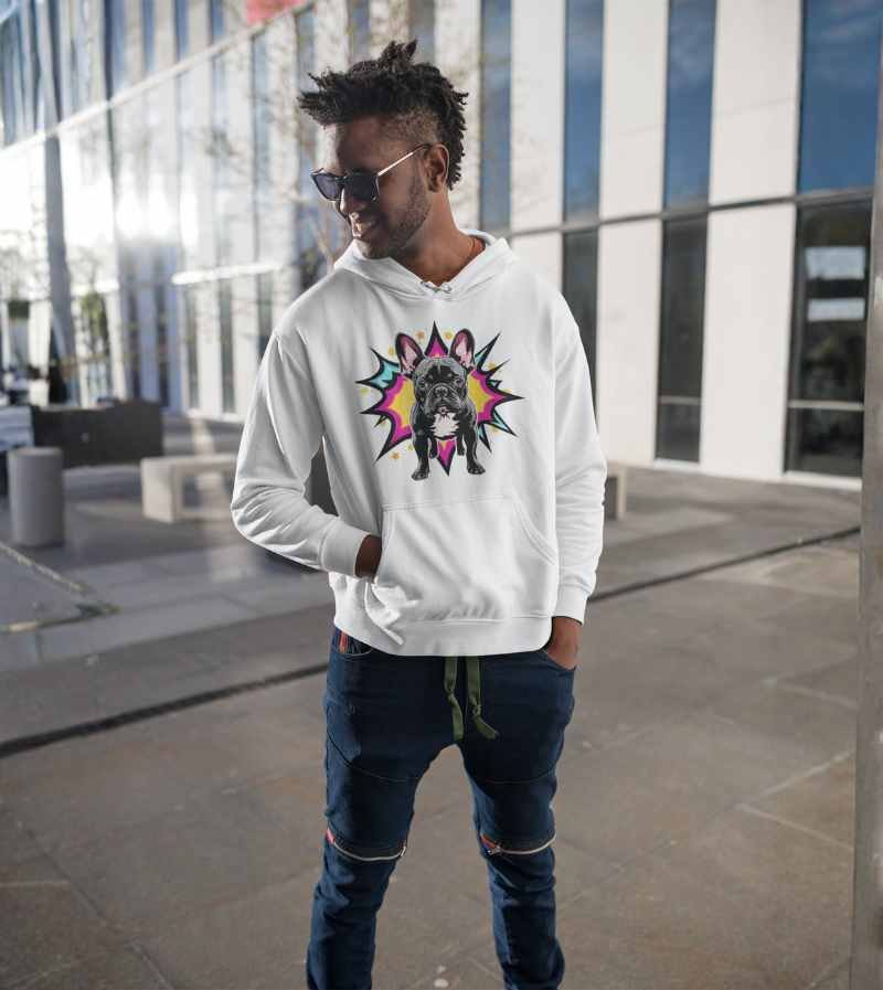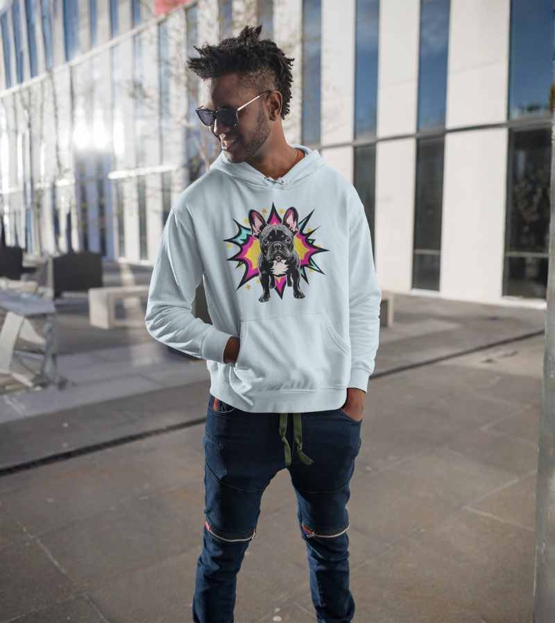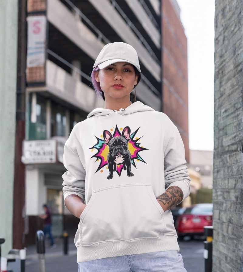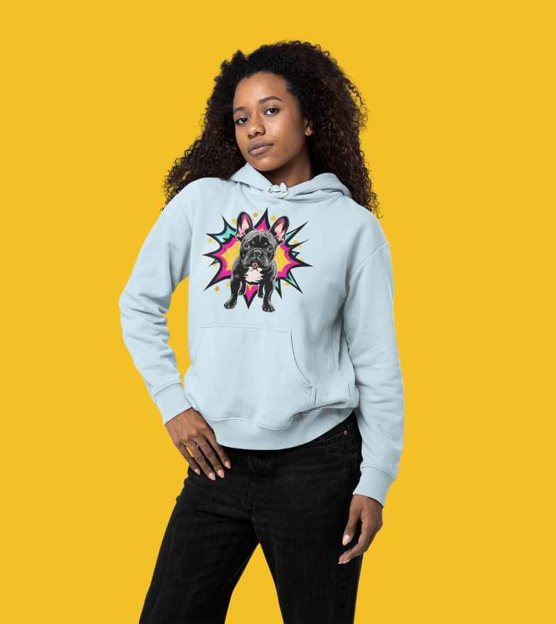 This vibrant, pop-art inspired design stars a charismatic French Bulldog standing strong and confident in front of an explosive, comic-style starburst. With huge ears, wide brown eyes, and that classic bulldog stare, this illustration bursts off the shirt with a mix of hot pink, yellow, teal, and orange—channeling all the attitude and charm Frenchies are famous for.